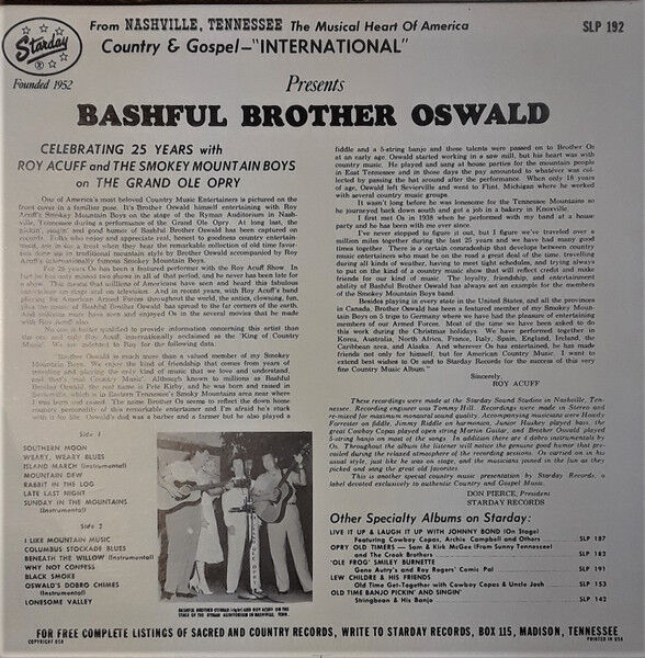 Title: Bashful Brother Oswald Celebrating 25 Years With Roy Acuff And The Smokey Mountain Boys On The Grand Ole Opry Vinyl LP USED