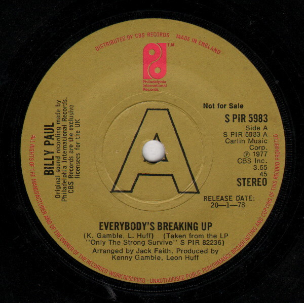Title: Billy Paul Everybody's Breaking Up USED VINYL 7INCH SINGLE PROMO
