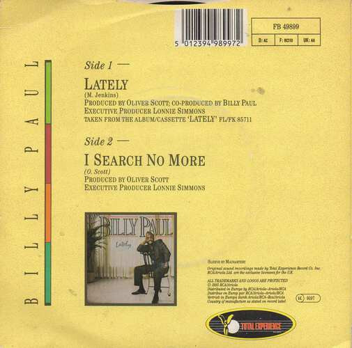 Title: Billy Paul Lately USED VINYL 7INCH 45 RPM SINGLE STEREO