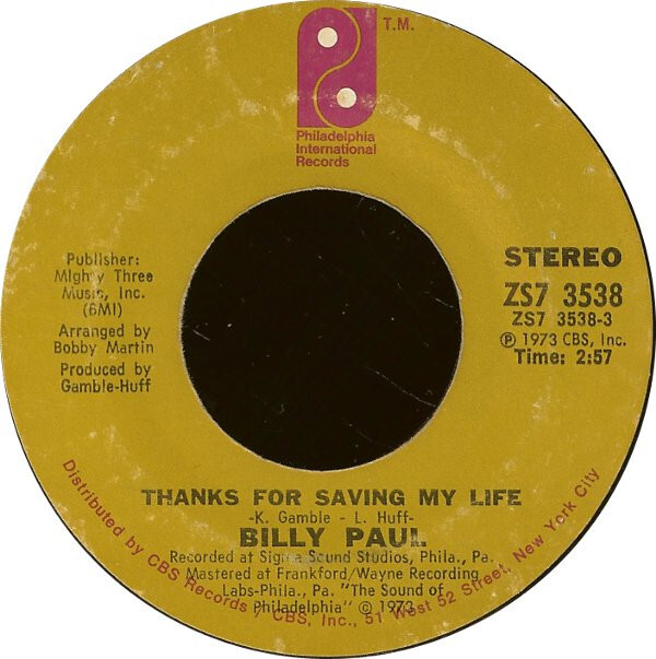 3. Billy Paul Thanks For Saving My Life USED VINYL 7INCH 45 RPM STYRENE