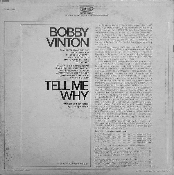 Notify me when Bobby Vinton Tell Me Why Vinyl LP USED is available.