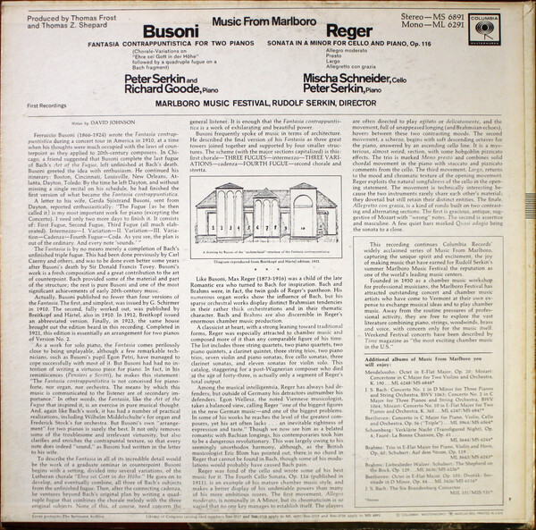 Title: Ferruccio Busoni / Max Reger / Peter Serkin / Richard Goode / Mischa Schneider Fantasia Contrappuntistica For Two Pianos / Sonata For Cello And Piano