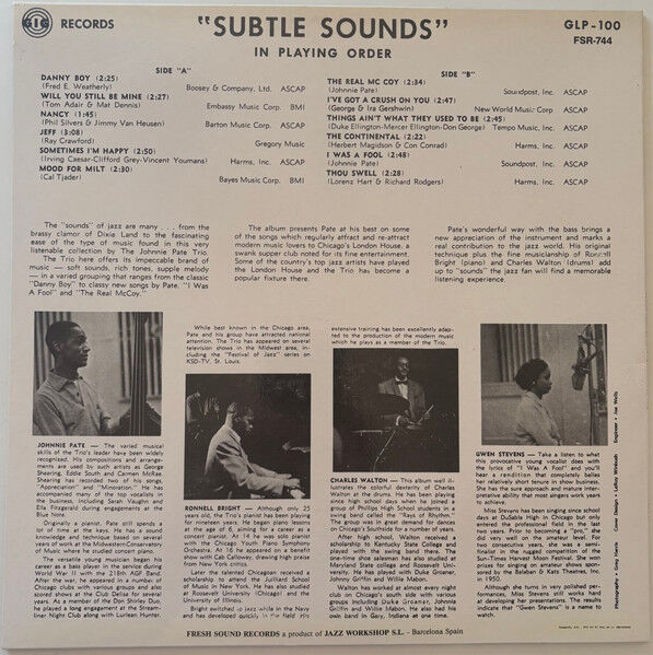 Notify me when Johnnie Pate Trio / Johnny Pate / Ronnell Bright / Charles Walton / Gwen Stevens Subtle Sounds Vinyl LP USED is available.
