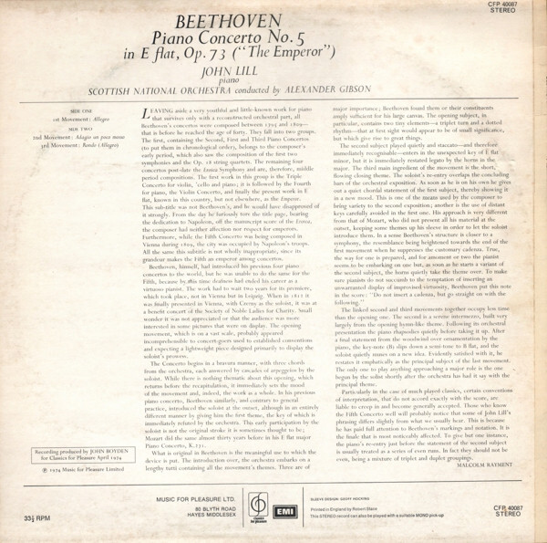 Ludwig van Beethoven;John Lill;Alexander Gibson;Ro Piano Concerto No. 5 "Emperor" VINYL LP USED