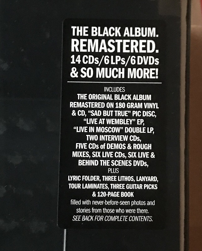 Limited edition deluxe numbered box set (with magnetic flap) of Metallica (Remastered) includes the album remastered on 180-gram double LP and CD, "Sad But True" picture disc, three live LPs, 14 CDs and six DVDs featuring unreleased content (live shows, rough mixes, demos, etc), MP3 download card of all audio, four tour laminates, lanyard, three lithos, three guitar picks, lyric folder and sheets, and a 120-page hardcover book with never-before-seen photos + stories from those who were there.