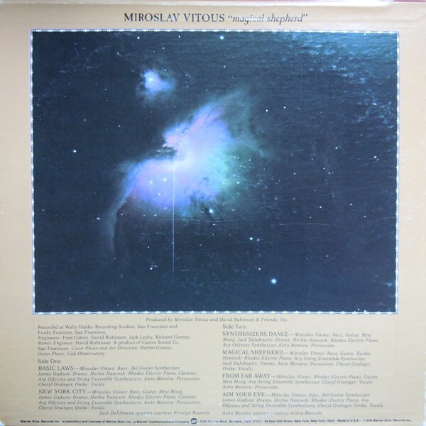 | B2 | Magical Shepherd Bass, Guitar - Miroslav Vitous Drums - Jack DeJohnette Electric Piano [Rhodes], Synthesizer [Arp String Ensemble] - Herbie Hancock Percussion - Airto Moreira Vocals - Cheryl Grainger Vocals - Onike |