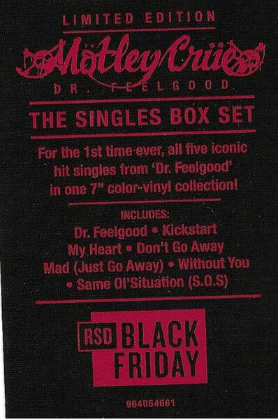 Five 7 in singles in a clamshell box set. Part of the 35th anniversary campaign. - Dr. Feelgood 7" single b/w Sticky Sweet (Green vinyl) - Same Ol Situation (S.O.S.) 7" single b/w She Goes Down (Clear vinyl) - Don't Go Away Mad (Just Go Away) 7" single b/w Rattlesnake Shake (Yellow vinyl) - Without You 7" single b/w Slice of Your Pie (Red Vinyl) - Kickstart My Heart 7" single b/w Wildside (White Vinyl) - 2 Motley Crue branded plasters/band-aids