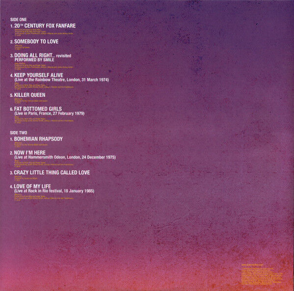 Songs like “Bohemian Rhapsody,” “Somebody to Love,” and “We Will Rock You” gain added presence on vinyl, where the contrast between quiet passages and explosive climaxes feels more physical and immersive. The inclusion of live tracks further benefits from the format, capturing the atmosphere and scale of Queen’s performances with a sense of immediacy. Listening across multiple sides encourages engagement with the soundtrack as a cohesive experience, rather than a highlights compilation, aligning with the film’s sweeping narrative approach.
