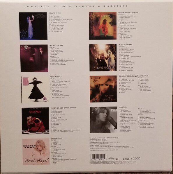This box set includes all eight studio albums and a set of rarities pressed on clear vinyl. Bella Donna and The Wild Heart were remastered in 2016 and lacquers cut by Bernie Grundman. 24 Karat Gold Songs from the Vault was mastered in 2014 and the remaining albums were remastered in 2023 and lacquers cut by Chris Bellman at Bernie Grundman Mastering. Pressed at GZ Media in the Czech Republic. Limited Edition of 3000 copies. Box Set & 2023 Rhino Entertainment Company Bella Donna 2023, 1981, 2016, 1981 Modern Records, Inc. The Wild Heart 2023, 1983, 2016, 1983 Modern Records, Inc. Rock A Little & 2023, 1985 Modern Records, Inc. The Other Side of the Mirror & 2023, 1989 Modern Records, Inc. Street Angel & 2023, 1994 Atlantic Recording Corporation Trouble in Shangri-La 2023, 2001, 2001 Reprise Records, Inc. In Your Dreams 2023, 2011, 2011 Reprise Records, Inc. 24 Karat Gold Songs from the Vault 2023, 2014, 2014 Reprise Records Rarities & 2023 Rhino Entertainment Company