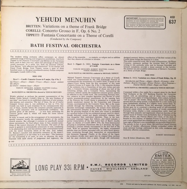 Title: Yehudi Menuhin / Bath Festival Orchestra / Benjamin Britten / Sir Michael Tippett / Arcangelo Corelli Variations On A Theme Of Frank Bridge / Fantasia